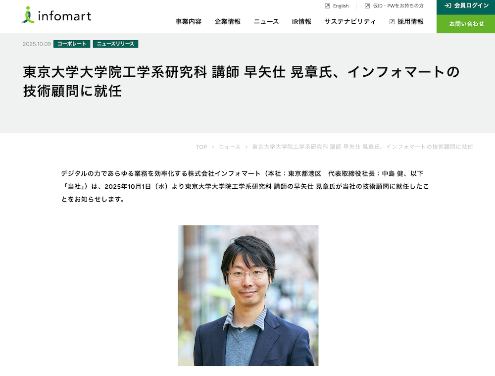 早矢仕講師は、2025年10月9日に株式会社インフォマートの技術顧問に就任しました。 現在、AIとデータの活用は取引の在り方やサービス産業の構造を根本から変革しつつあります。これまで培ってきた学術的…