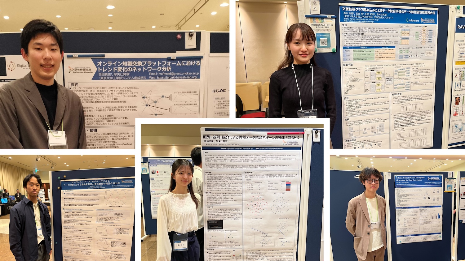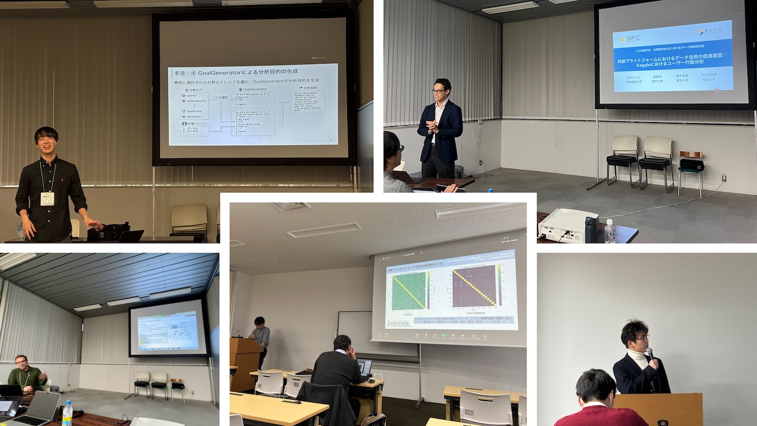 2025年12月1日(月)~3日(水)に慶應義塾大学で開催された人工知能学会 合同研究会2025 (SIGAIs 2025) にて修士2年の指原さん・山本さん、修士1年の程さん、共同研究者の清水准教授(慶應義塾大学)、Belleguieさん(Quollio Technologies)が口頭発表を行いました。